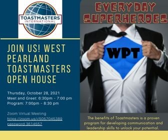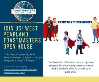 Please join the members of West Pearland Toastmasters for a Virtual Open House on Thursday, October 28th at 6:30 pm on Zoom. This event is open to the public. During the Open House program, our club officers will discuss the many benefits of joining Toastmasters’ proven program and the club experience.