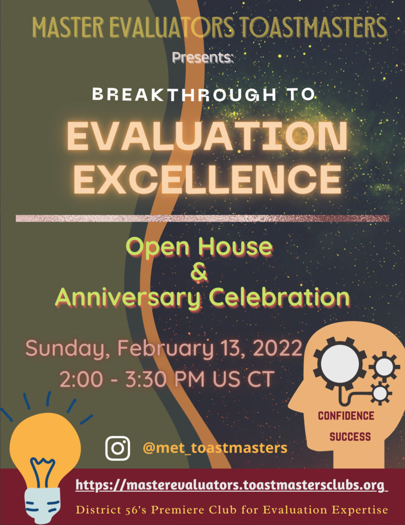 Can you give an effective, expressive, and equitable evaluation regardless of the speaker’s topic or experience level? If you are unsure, we encourage you to attend Master Evaluators’ Breakthrough to Evaluation Excellence Open House & Anniversary Celebration. Topic: MET Open House & Anniversary Celebration Time: Feb 13, 2022, 2:00 PM Central Time https://us02web.zoom.us/j/89807287027?pwd=VXFJRklKeWJCY09jTHB5am00eWVQUT09 Meeting ID: […]