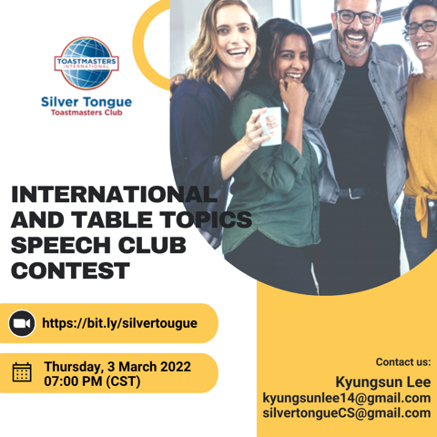 Silver tongue Toastmasters Club in College Station, Texas (Club # 1620, Dist #:56) will have speech contests next Thursday, March 3rd, 2022. The speech contest is open to the public. It is an online event, so you can join anywhere in the world! Please come and enjoy the speech contest. If you want to develop […]
