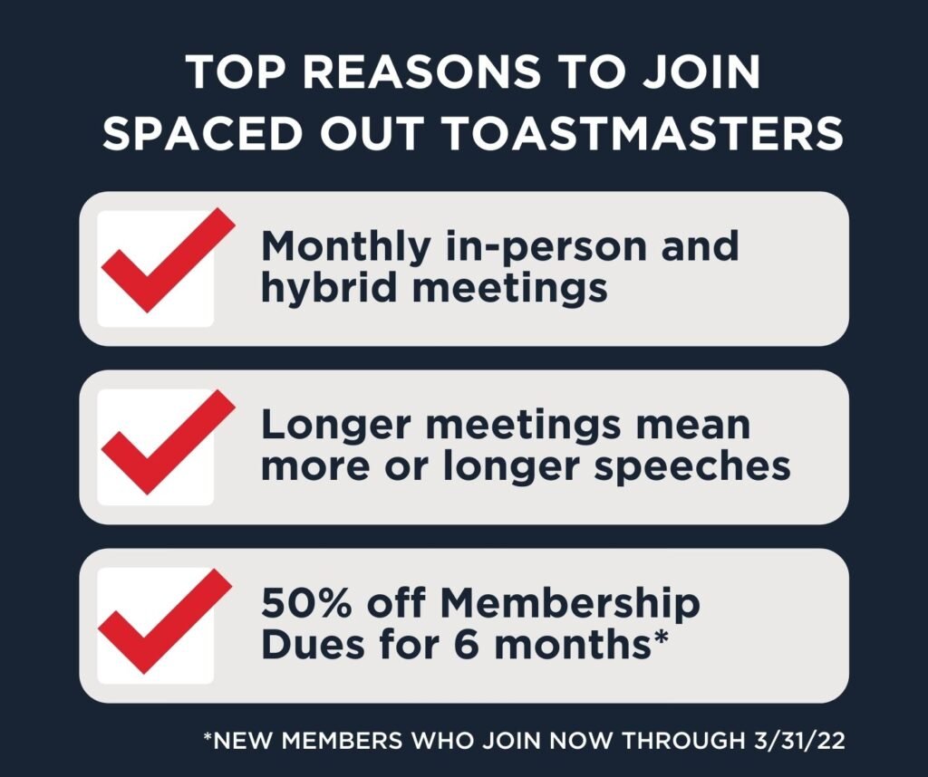 Spaced Out Toastmasters 1/2-Price Membership Drive