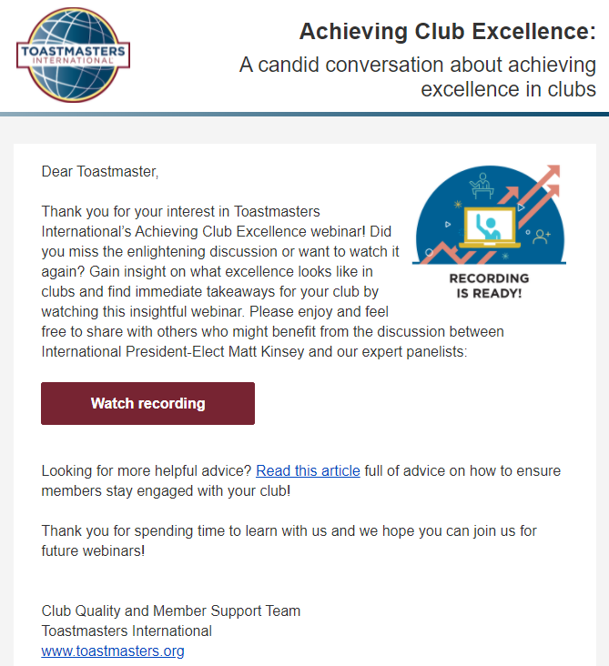 Did You Miss Achieving Club Excellence Webinar hosted by International President-Elect Matt Kinsey? The recording is now available at https://emails.toastmasters.org/q/1taQINmdmzWIH3Q7bsabIDvk/wv