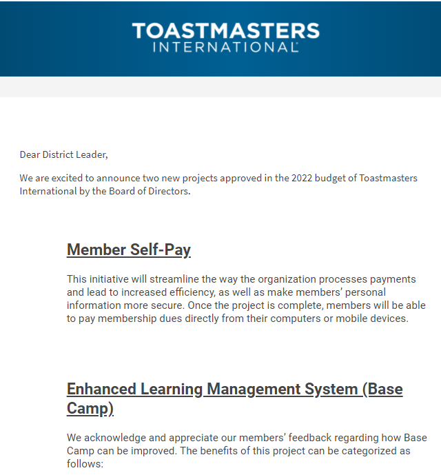 Toastmasters International announced two new projects approved in the 2022 budget by the Board of Directors. Member Self-Pay Enhanced Learning Management System (Base Camp) To read the entire announcement, click https://emails.toastmasters.org/q/1taQINmdlV9usLvOuNr6Wi8K/wv
