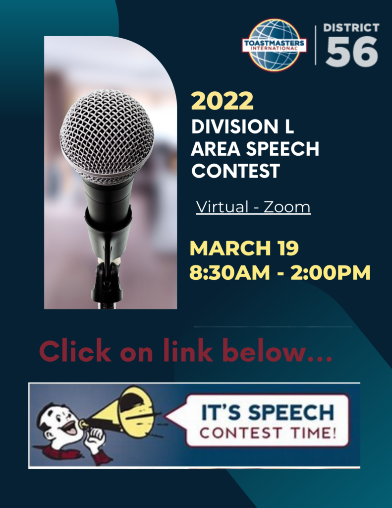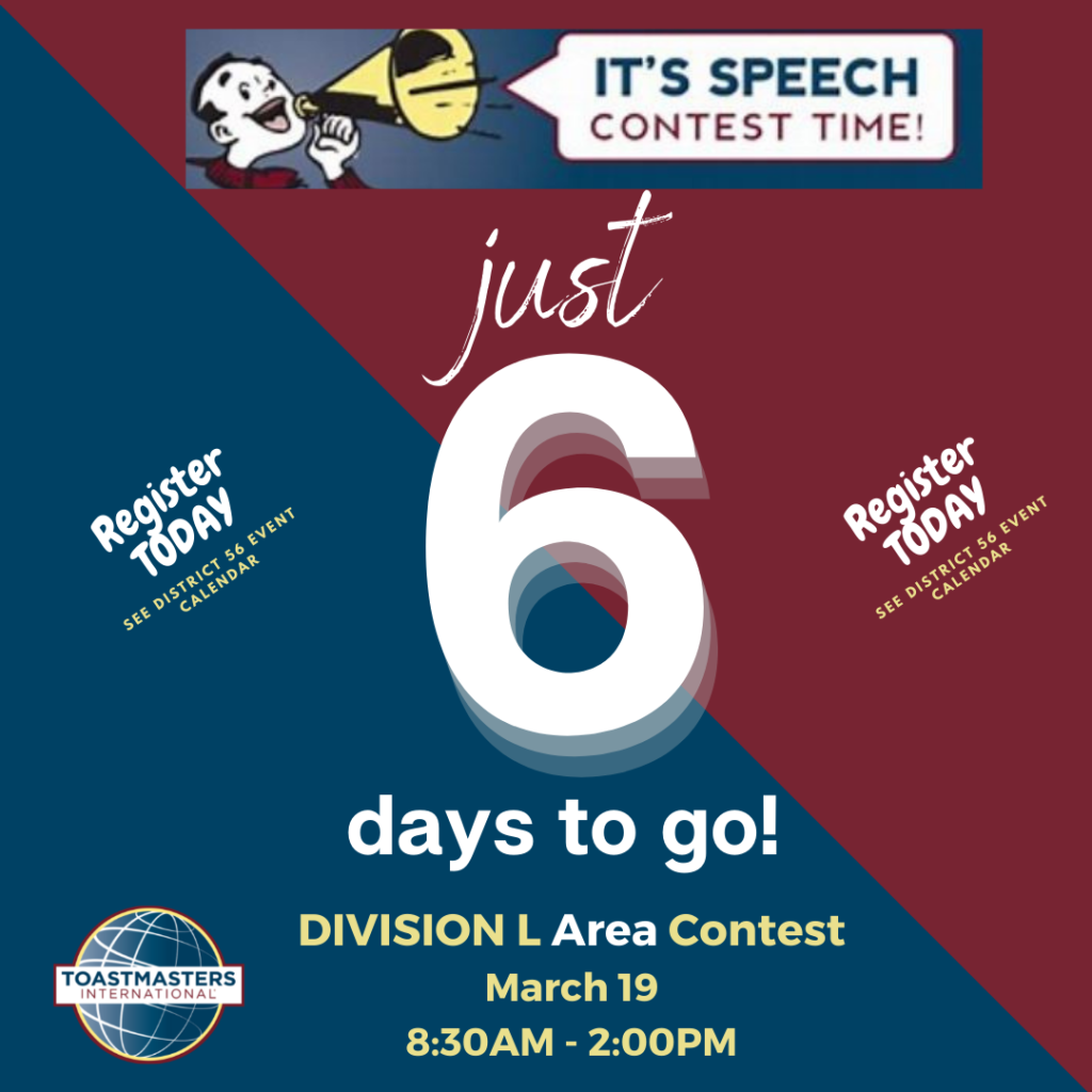 📣📣📣 6 DAYS to the Division L AREA contest! The Division L team is excited to invite you to their area contest this coming Saturday. Please join us to witness the competition of Areas: L-40 L-41 L-42 L-43 L-44 You can register at any time by going to 👉 https://toastmastershouston.sitedevpro.com Events Calendar March 19 – […]