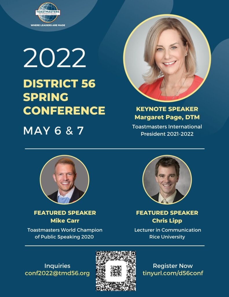 Greetings, Toastmasters! Following our announcement that the 2022 District 56 Spring Conference will remain virtual, we’re excited to announce that tickets are on sale. Following the success of our previous virtual conference, we look forward to more opportunities to bring the community together virtually and to share the wonderful energy with each other wherever you […]