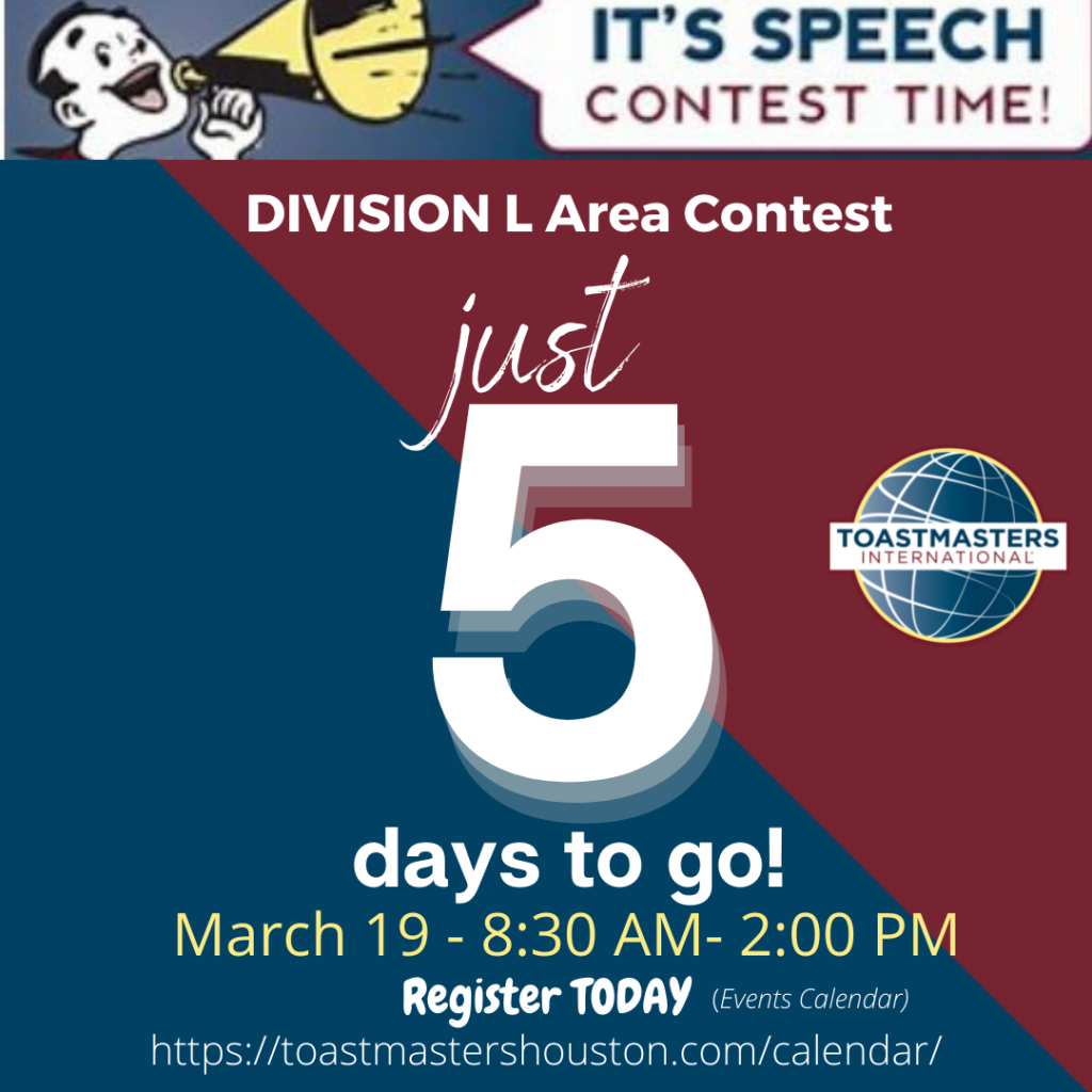 📣📣📣 The Countdown is on for the Division L AREA contest. You can register now at: ⌨https://toastmastershouston.sitedevpro.com 🖱Events 🖱Calendar – go March 19 and click on the Zoom link