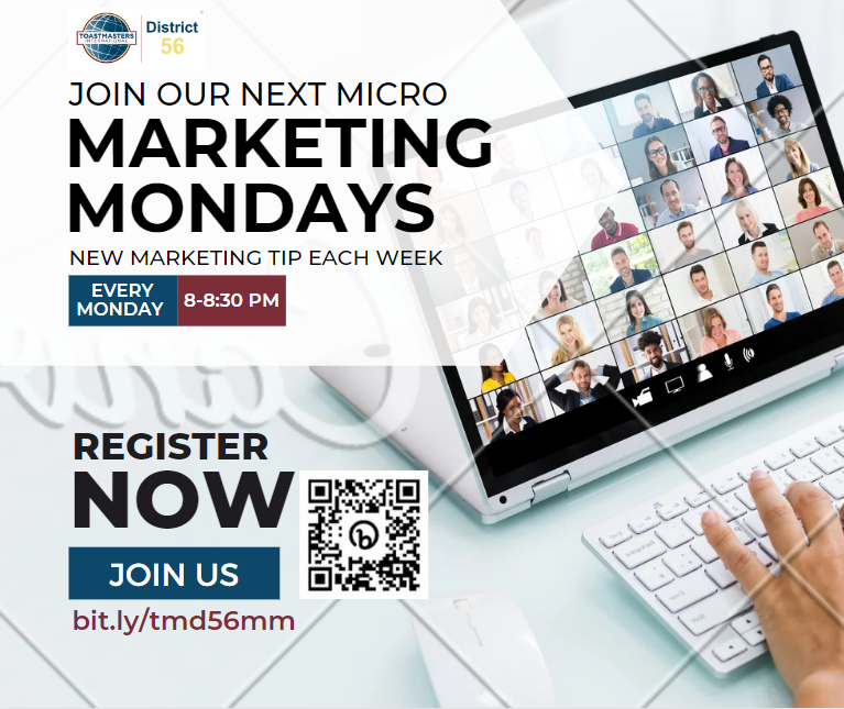 Email your club Get to Know Me Tag – My Toastmasters Journey Club Video challenge to Elizabeth Ruiz, Club Growth Director, at cgd@tmd56.org on or before February 1, 2023. Only the qualified club videos will be uploaded to the District website and social channels where members will vote on first, second and third place. First place club winner receives a $100 Toastmasters International Gift Certificate. Second place club winner receives a $50 Toastmasters International Gift Certificate. Third place club winner receives a $25 Toastmasters International Gift Certificate. The Get to Know Me Tag – My Toastmasters Journey Club Video Challenge was taught in the 12.12.22 Marketing Mondays session. Members must watch the recording and read the handout located in the Marketing Mondays shared Google drive labeled 12.12.22 NEUROLOGICAL BUZZ here MARKETING MONDAYS – Google Drive.