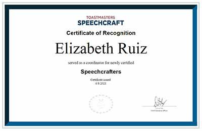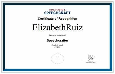 District 56 member, Elizabeth Ruiz, DTM, successfully coordinated and completed the first two digital Speechcraft programs. The first club she successfully coordinated a Speechcraft program is VNS Voices Toastmasters Club where she is President. A few weeks later, Elizabeth went on to successfully coordinate a second digital Speechcraft program with League City Toastmasters where she is Vice President Education. She signed up ten new members from the Speechcraft programs and earned four official awards signed by Dan Rex: two certified Speechcrafter certificates and two as a Coordinator for newly-certified Speechcrafters!
